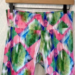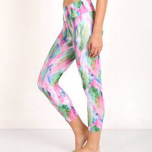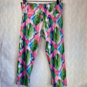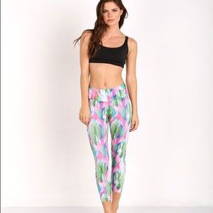 Onzie - Diamond Palm Crop Legging. These capri-length leggings feature all-over prints that are totally unique. Moisture-wicking and great fitting, they add a punch of fun to any workout look. 80% Nylon, 20% Spandex. Lining:100% Polyester. Made in USA.