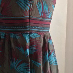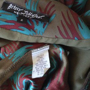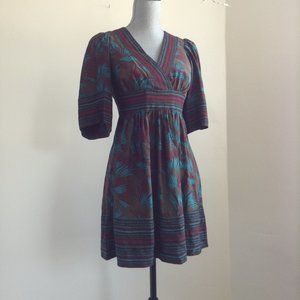 BETSEY JOHNSON V-NECK EMPIRE WAIST PRINT GREEN SHORT MINI DRESS 3/4 LONG SLEEVE