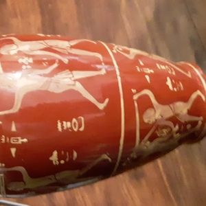 Vintage vase with a red and tan glaze on it with a warrior fighting designs on it around 12 inches tall and 6 inches in circumference