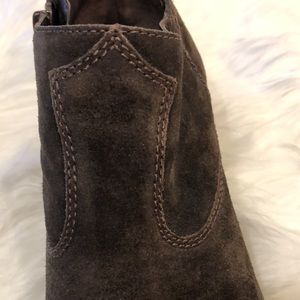 Brown suede booties with side zip. Distressed smoother toe and back. Leather upper. Balance man- made materials. Small dot I just noticed on baby toe area. Not sure if it’s always been there (pictured). Heel measurements are in photos.