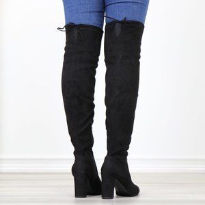 Pointy Toe Black Faux Suede Thigh High Over The Knee Block High Heel Boots