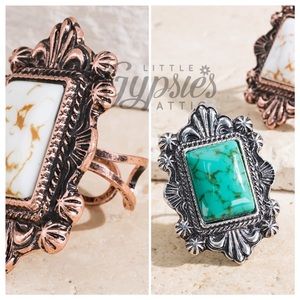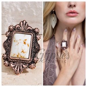 Square Natural Howlite Stone with Motif Cuff Ring and Copper Color Plating with Purposeful Tarnishing for a Vintage Western Look.