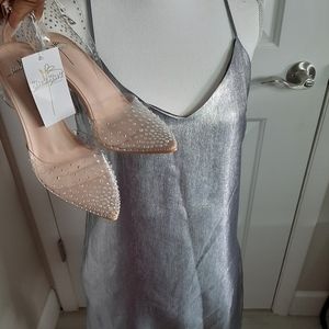 New without tags. Fully lined non stretch material. True to size. Perfect for a straight body type. Straps do not adjust. No pockets. Goes so good with those clear Lucite and rhinestone heels ** heels sold on a different listing.