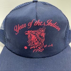 Vintage 1992 Year of the Indian Trucker Hat. Adjustable. Blue. Good condition, some discoloration on inside.