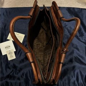 Beautiful Fossil Satchel!! This is a beautiful bag from the very stylish Vintage Reissue line. Antiqued brass tone hardware detail this gorgeous bag to make it feel like a favorite vintage piece! There are two exterior slip pockets, one on front and one on back. It has a zip top closure leading to Fossil fabric that fully lines the interior of this spacious bag! Inside you will find 2 sections. One section has multifunction pockets and the other section has 1 zippered pocket with leather zipper pull and Fossil authenticity patch! Sure to be a favorite and will be a classic for many years to come! Great for any Season!!