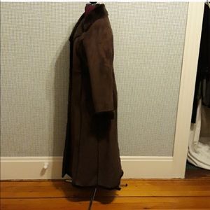 Maxi length, faux suede outside and fur lined inside, side slash pockets and button front.