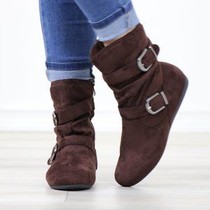 Brown No Heel Flat Boots Round Toe Above Ankle Booties Faux Suede