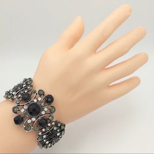 Vintage Look Filigree Wide Black Clear Rhinestone Chunky Hinged Bangle Bracelet