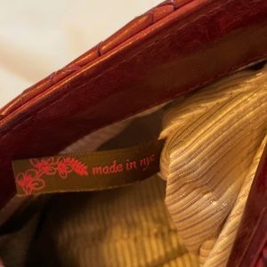 Beautiful Lauren Merkin clutch in a deep red woven leather. Very chic for a night out or as an everyday clutch. Small marks on inside and small stains on edges of outside that blend in well with the different reds. Clutch pulls open but requires holding to keep open. Very soft leather beautiful red leather.