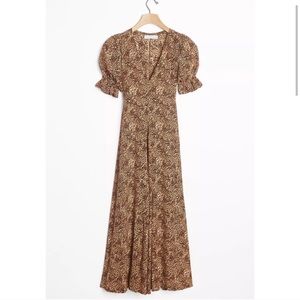 Faithfull the Brand Anthropologie exclusive Maggie midi dress. Color is called Charlie Leopard.