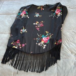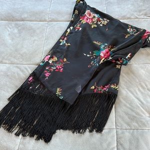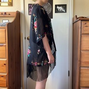 Sheer black floral kimono with fringe at hem. Lightweight and pretty without being precious~ offers sun protection at the pool, beach, or park! 🖤🌹