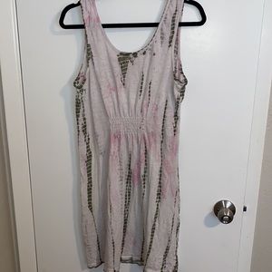 Comes up just above my knee. Pink tie-dye dress. With green snakeskin design. Very comfortable dress. 100% cotton