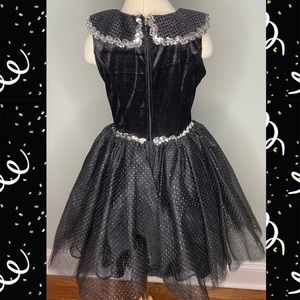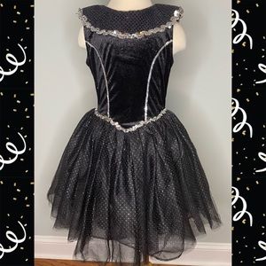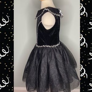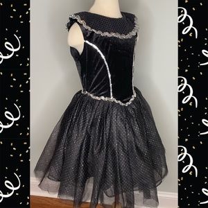 Pretty, fun & versitle girl’s costume for dance, for masquerade parties or for Halloween (just add witch hat, gloves, masks, etc.). The bodice, back and collar are made of a velvety feeling fabric and trimmed in silver sequins. The multiple skirts are constructed for form and flow. The two top layers a glittered toile, followed by a two layers black fabric and a crinoline skirt, too. Looks like a great dress for dress up playtime, too. Good loved condition with no tares, holes or stains, however, some seam reinforcement may be required on the crinoline skirt.