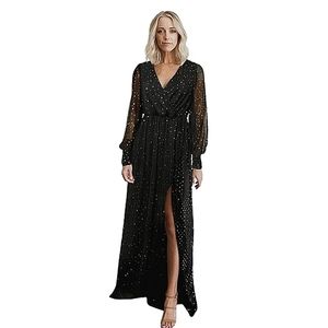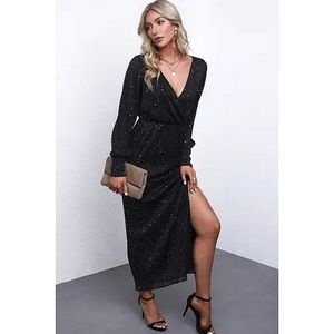 You're sure to shine like a star in this stunning plus size v-neck maxi dress. β¨ Features gold sparkles and a stylish side leg split. Only 2 in stock. Get yours before it's gone!