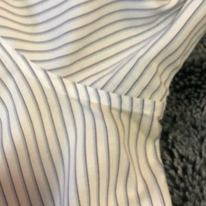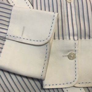 Brooks Brothers Non-iron v-neck fitted dress shirt, white w blue, pink, & black stripe sz 2. Light blue pick stitching on collar, placket and cuffs.