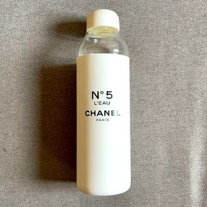 A glass water bottle (590 ml) whose label adopts the same visual identity as the N°5 perfume bottle.