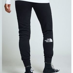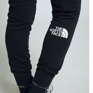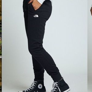Drew Peak joggers by The North Face. All black sweat pants / joggers, white NF logo near left pocket and oversized logo on back left calf, two functional side pockets, fleece-lined, drawcord waistband, high rise, and relaxed fit. Only tried on! Like new condition! Sold out in many places online.