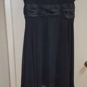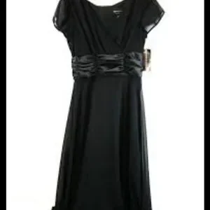 Connected Woman below the knee black dress. V neck short flutter sleeve.