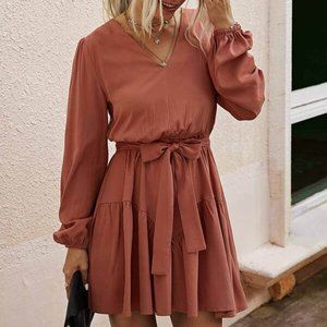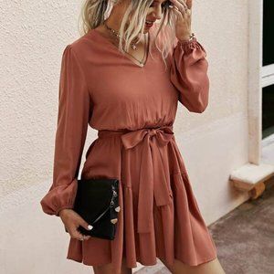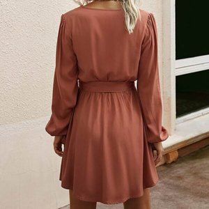 V Neck Lantern Sleeve Belted Dress - redwood