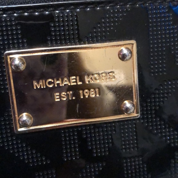 Black and gold Michael Kors wristlet. Perfect for vacations or where you don’t want to tote a big purse clubbing sightseeing etc. Has compartment for your phone to fit in and slots for ID and a side for cash bills the zipper is in pristine condition and the leather wrist strap can be clipped on or taken off