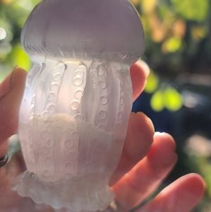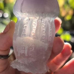 This is a BEAUTIFUL little light colored Fluorite hand carved jellyfish. This is mostly white in color with some pink and a little bit of purple at the top. This lighter color of Fluorite is HARD to find! This piece is close to 3" tall and over 2" in diameter. Please ask questions and make an offer. I can't say yes if you don't ask!