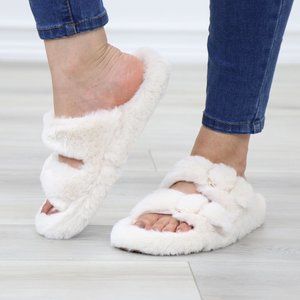 Beige Puff Fuzzy Fluffy Slip On Plush Slippers Double Strap