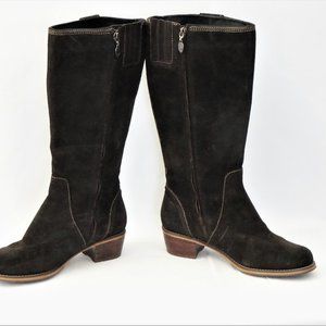 Bixby style ( I believe, 4901) boots by Red Wing in a dark brown suede with light tan stitching. They are a size 9 1/2 D which is a wide width. Leather upper, man made balance. Faux wood stack heels. There is elastic in a section at the top of the shaft to allow for wider calves. Full length inner zipper. I only wore these boots once but they did get kicked around in my closet for a bit so there are some very superficial marks to them but nothing too bad. One longer crease. There is light wear on the coloring on the back of the heel from driving. 16" tall up the back including heel. Calf opening 16" around NOT stretched. Approximately 10.5" long measured inside, heel to toe. Heel just shy of 2" tall.