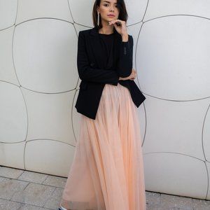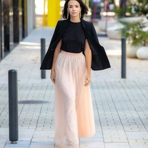 The Powder Gala Tulle Skirt is floor length. Advised for women 5'6'' or taller.