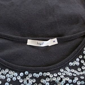 Charcoal with pearl colored sequins cover the front of this tank.