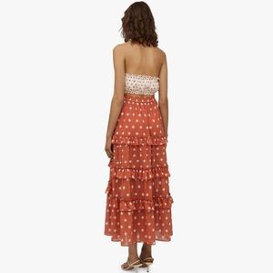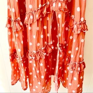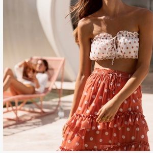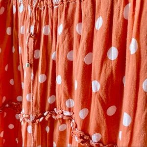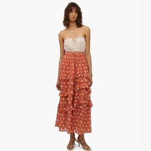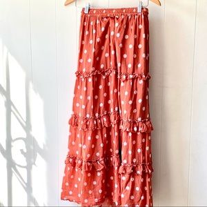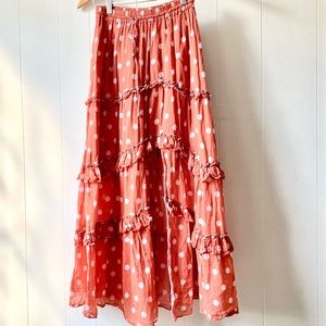 This maxi skirt features an elasticised waistband with drawstring, tiered ruffles, and a side slit.