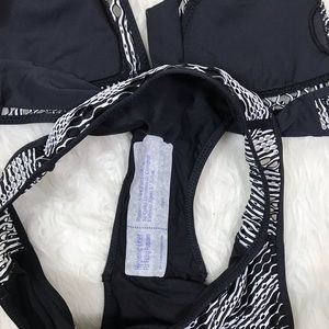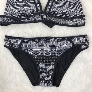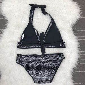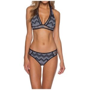 Courtney halter bikini top features sheer cut outs with binding in a multi color crochet pattern, a supportive underbust band and removable halter cups. Offers thick adjustable ties at neck and back.