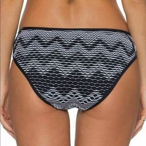 A crochet-inspired overlay brings beachy texture to hipster bikini bottoms styled with moderate back coverage.