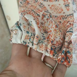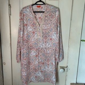 Worn once, lightweight with a beautiful pattern. Tie waist. Lace detail around neck. Fits true to size.