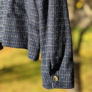 This is a super cute navy pattered blazer with an incredibly soft jersey lining. The sleeves are lined with a silky smooth light grey polyester to create a cute contrast when cuffed. It's a single button front closure.