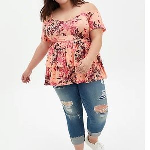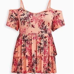 Super Soft Peach Floral Cold Shoulder Babydoll Top