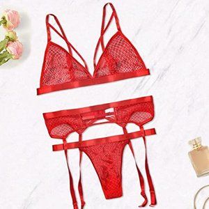 Fishnet Lingerie Set is Brand New, Never Been Worn. Set includes 1 strappy bra/ 1 matching panty/ 1 garter belt/ 1 pair of thigh cuffs.