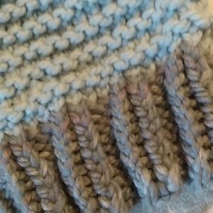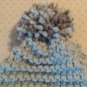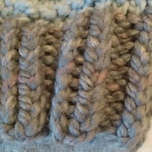 Shades of blue and gray hand-knit garter stitch winter hat. Gray marbled cuff is knit and purl from 20% wool, 80% acrylic, body is 100% acrylic. Large pom pom is a mix of both colors.