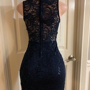 Women junior blue navy lace sequins halter bodycon mermaid maxi dress size (S) sleeveless zipper back 97% polyester 3% spandex