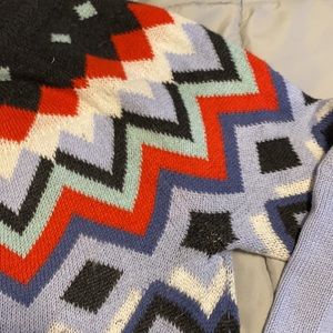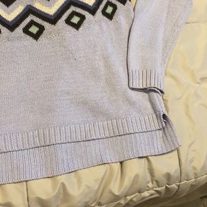 Grey reddish orange aqua and baby blue colors. Soft not itchy. A little bit of a high low effect at the hem (as pictured). Great winter sweater!!!