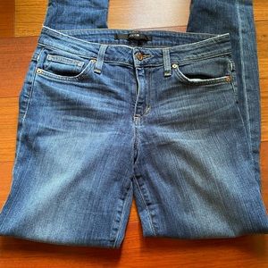 In good condition, no rips or stains . 4 pockets , zipper fly , frayed at the ankles , 98% cotton , 2% spandex , blue denim . Approximate measurements: