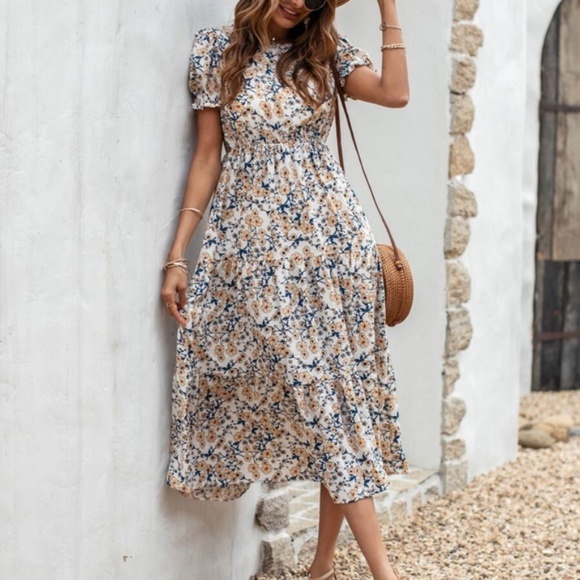 Boho floral print puff sleeve A-line midi dress