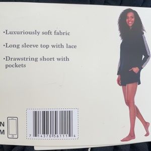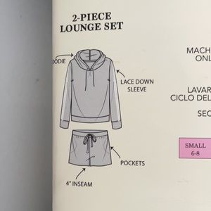This lounge set has hoodie with lace down sleeve.The bottom has short with 4” inseam, pockets, waist band with drawstring to adjust waist. It is super soft and stretchy fabric.
