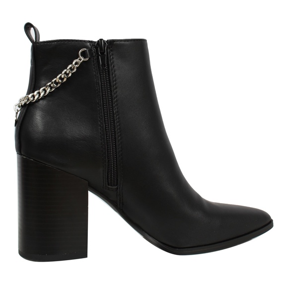 Chain lace ankle bootie featuring pointy toe, faux leather, and stacked block heel 3 1/2". True to size, but if you are in between sizes order the bigger size. Model is between size 7 and size 7.5. She would order size 7.5.