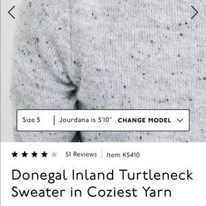 “Made of our signature Coziest Yarn, this Donegal sweater is kitten-on-a-cloud soft. With a subtly rolled turtleneck and cuff-able sleeves, it's so easy to dress up or down.”