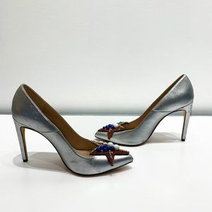 Irreverente star eels in metallic silver. Featuring a pointed toe, a rhinestone star detail, and a stiletto heel. Gently worn, please note there are small scuff marks throughout.