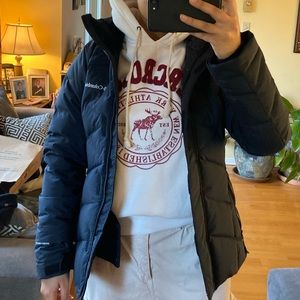 Off-white unisex hoodie, with burgundy letters. 2 side pockets, drawstring hood. Size X large (made small).