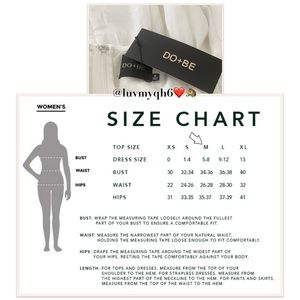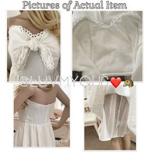 Do + Be White Eyelet Strapless Front Tie Knot Dress. This pretty little thing is the perfect dress that flatters and accentuates the body. No bra cups but is lined with wires. Fully Lined. Color - White. Size - Medium. Measurements approximate (laying flat). Waist- 14 in. Armpit Seam to Armpit Seam - 16 in. Length from back top to bottom hem - 24.5in. Front from top Bust area to bottom hem - 26 in. Material - Shell 100% polyester Lining 100% Cotton. Care - Hand wash, Do Not Bleach. Line dry, Do Not Iron. New With Tags!