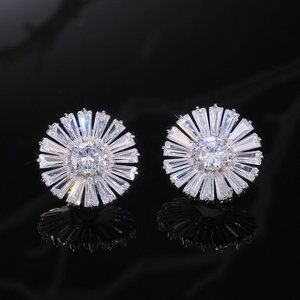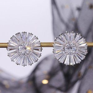 Silver Baguette Round Diamond Sunflower Earrings
