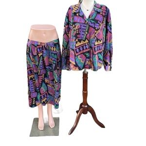 Lilli Ann Collections (Set) Blouse and Skirt~ Size Large. This is made in U.S.A. This outfit is in MINT condition with NO tears or stains on the fabric!! This outfit is stylish with bright colors and geometric designs. It feels like silk against your skin.