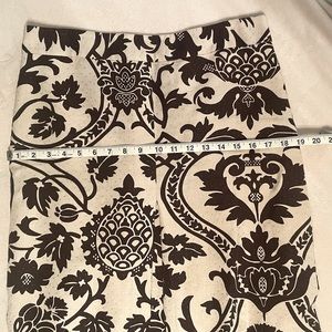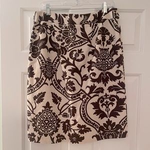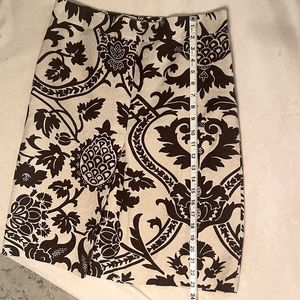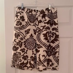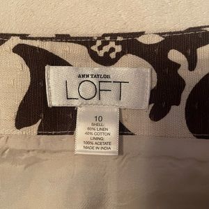 The skirt has a dark brown print on cream fabric. Linen/cotton blend, Ann Taylor Loft size 10. This is a really pretty skirt!